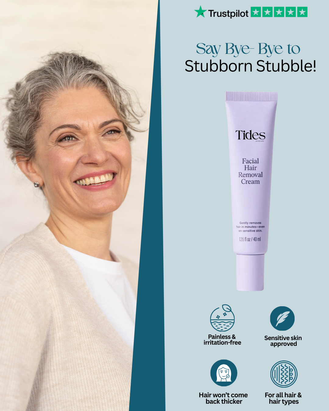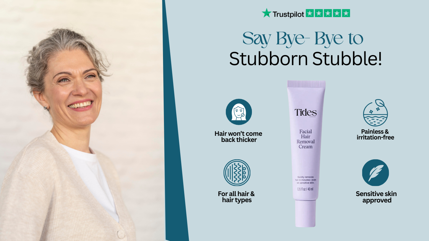 Our gentle facial hair removal cream is designed for women over 45 and trusted for safe, effective results. Specially made for sensitive, mature skin, it removes hair quickly and comfortably, leaving your skin soft, smooth, and radiant — so you can feel confident and cared for every day.